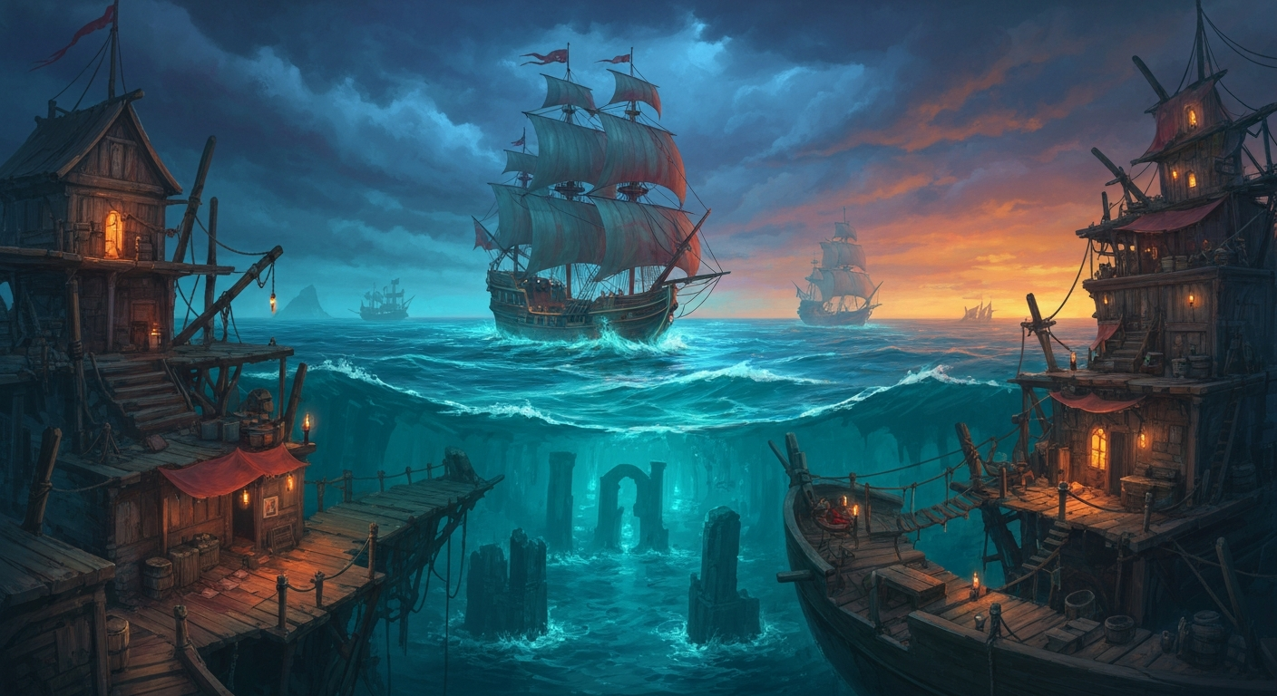 townA chaotic pirate port built on lashed-together shipwrecks and floating platforms. Rope bridges connect taverns, fighting pits, and market stalls. The whole town sways with the tide. No laws — only the Pirate Code, enforced by Captain Redtide herself.