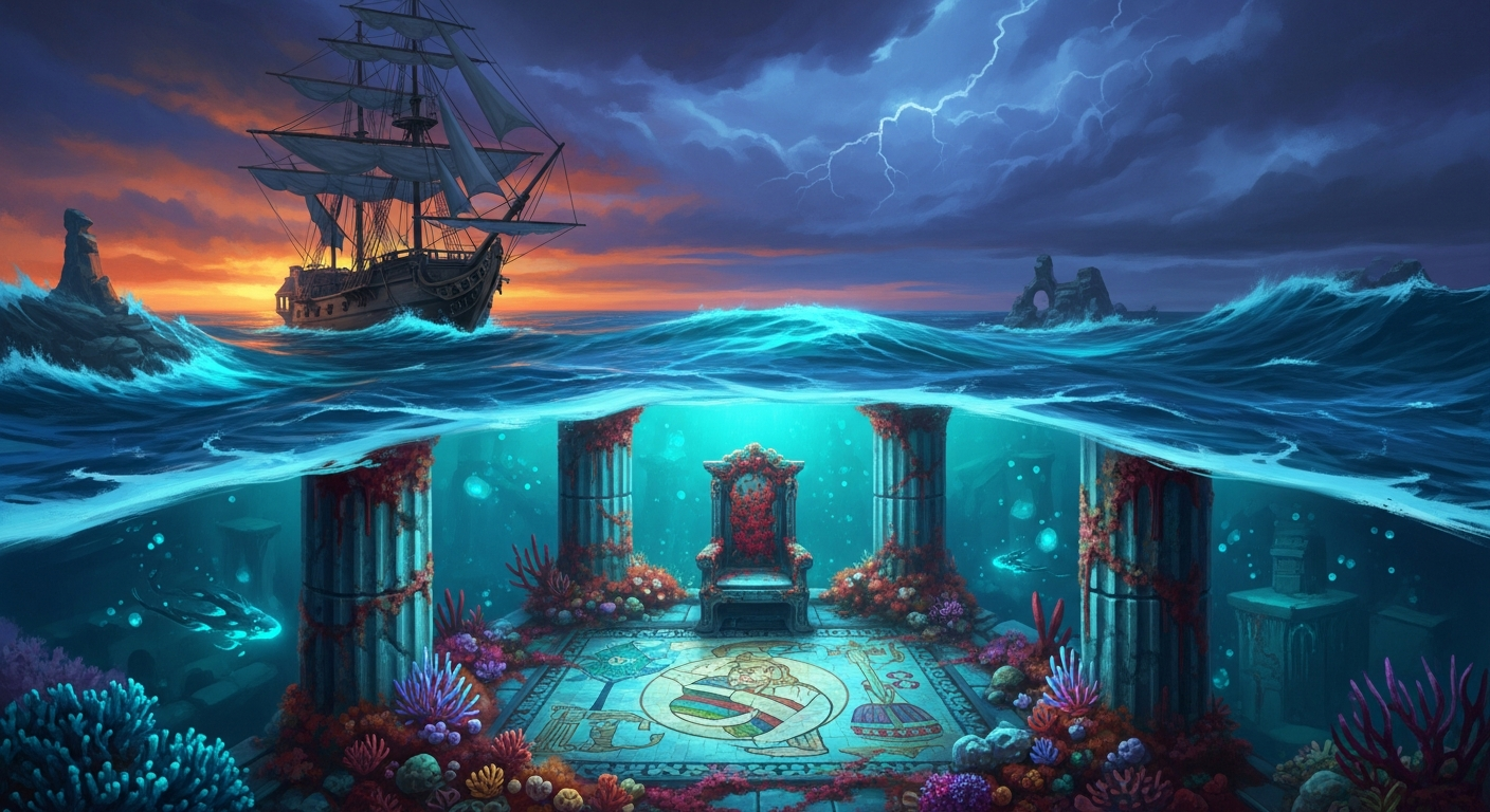 ruinsThe drowned throne room of ancient Meridia, accessible only during the lowest tides. Coral-encrusted pillars frame a mosaic floor depicting the original kingdom. The fourth map piece is embedded in the throne itself — but the ruins are guarded by tidal traps and something that moves in the deep water.
