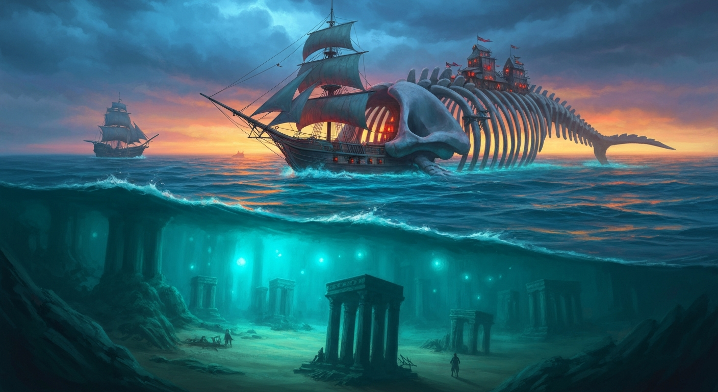 marketA neutral trading post built on a massive whale skeleton that juts from a sandbar. Neither pirate nor Navy territory — violence here is punished by permanent exile. Everything is for sale: weapons, secrets, maps, people. The most dangerous deals happen after dark in the Ribcage, the tavern inside the whale's chest cavity.